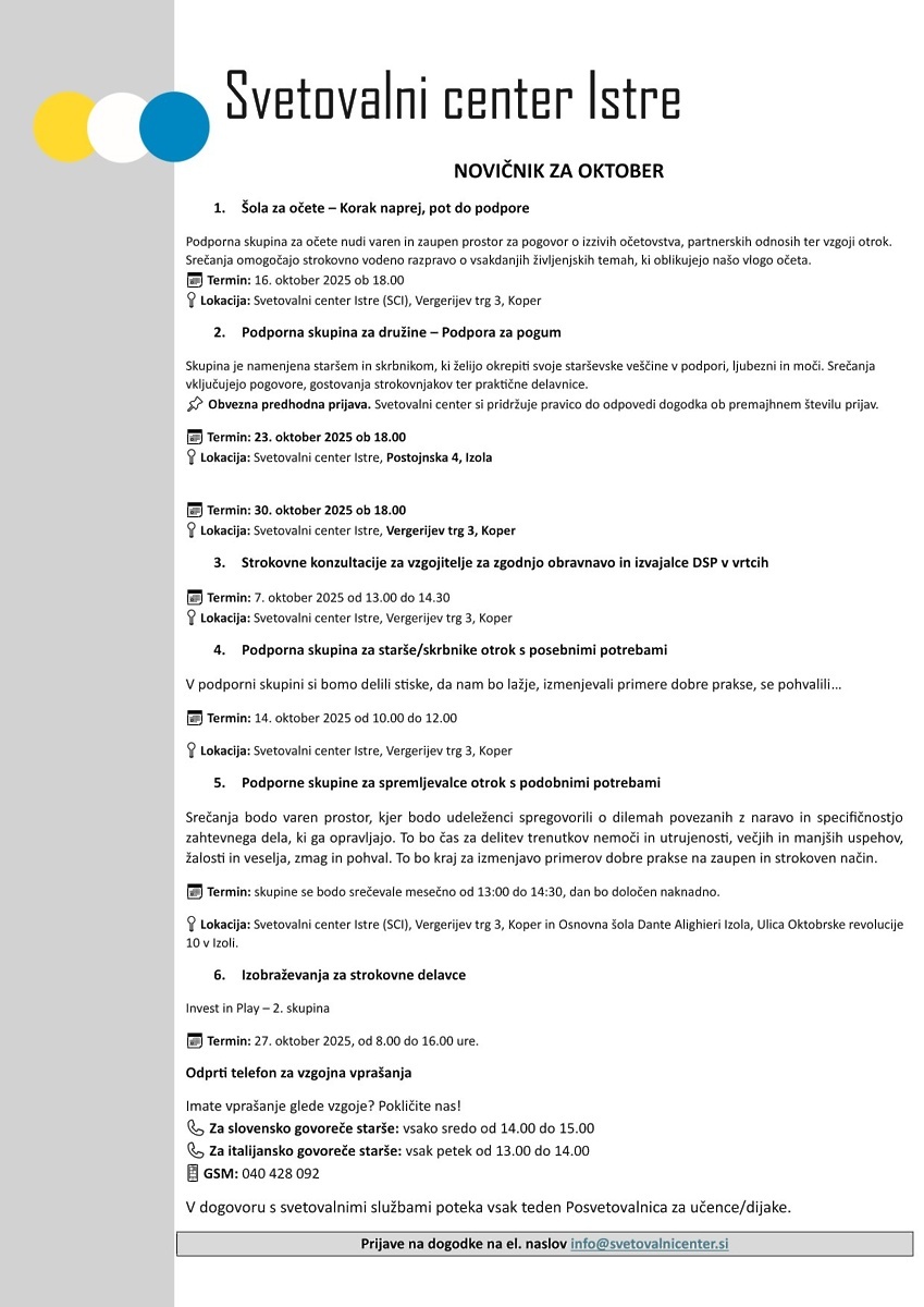 Vabilo na dejavnosti Svetovalnega centra Istre