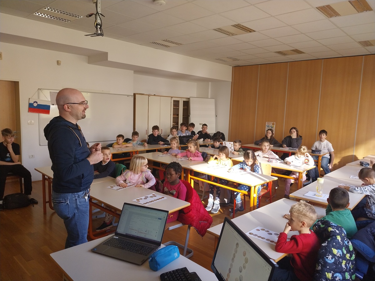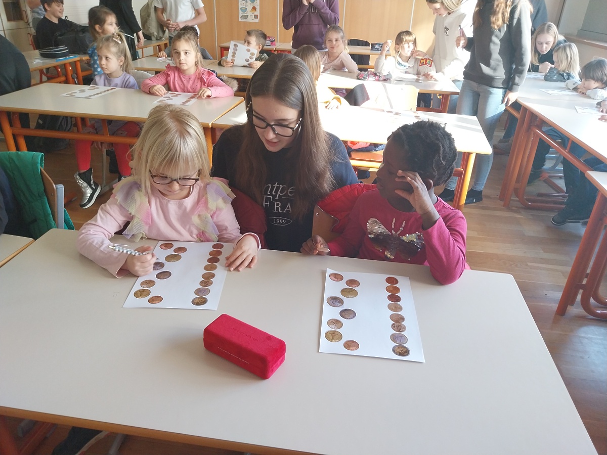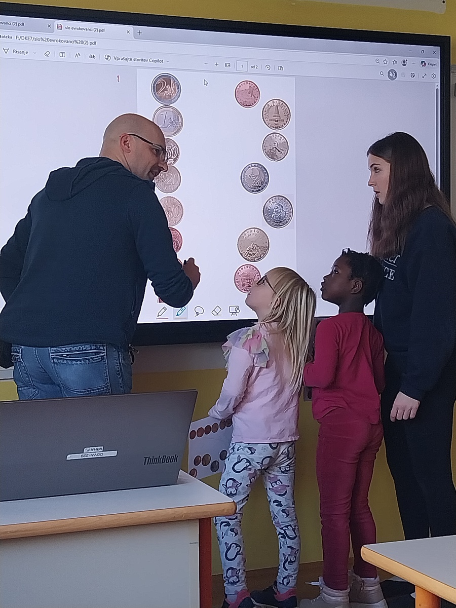 Skupina Delfinov, je obiskala šolo, kjer so sodelovali pri predmetu domovinske in državljanske kulture ter etike. Učitelj Miha Franca je pripravil zanimivo in poučno dejavnost. S pomočjo delovnih listov s kovanci so učenci skupaj z vrtčevskimi otroki reševali nalogo, se pogovarjali in sodelovali pri delu. Skupna dejavnost je otrokom omogočila prijetno izkušnjo šolskega okolja, spodbujala sodelovanje med vrtcem in šolo ter prispevala k razvoju socialnih veščin, občutka pripadnosti in pozitivnega odnosa do učenja.