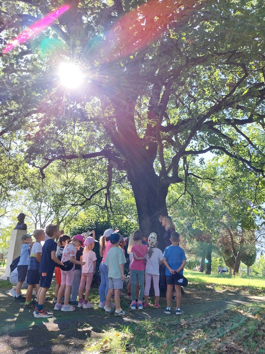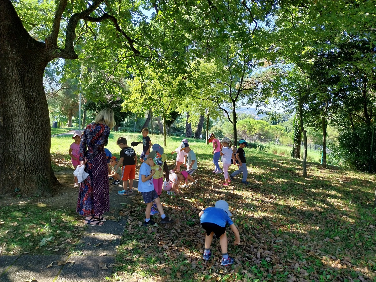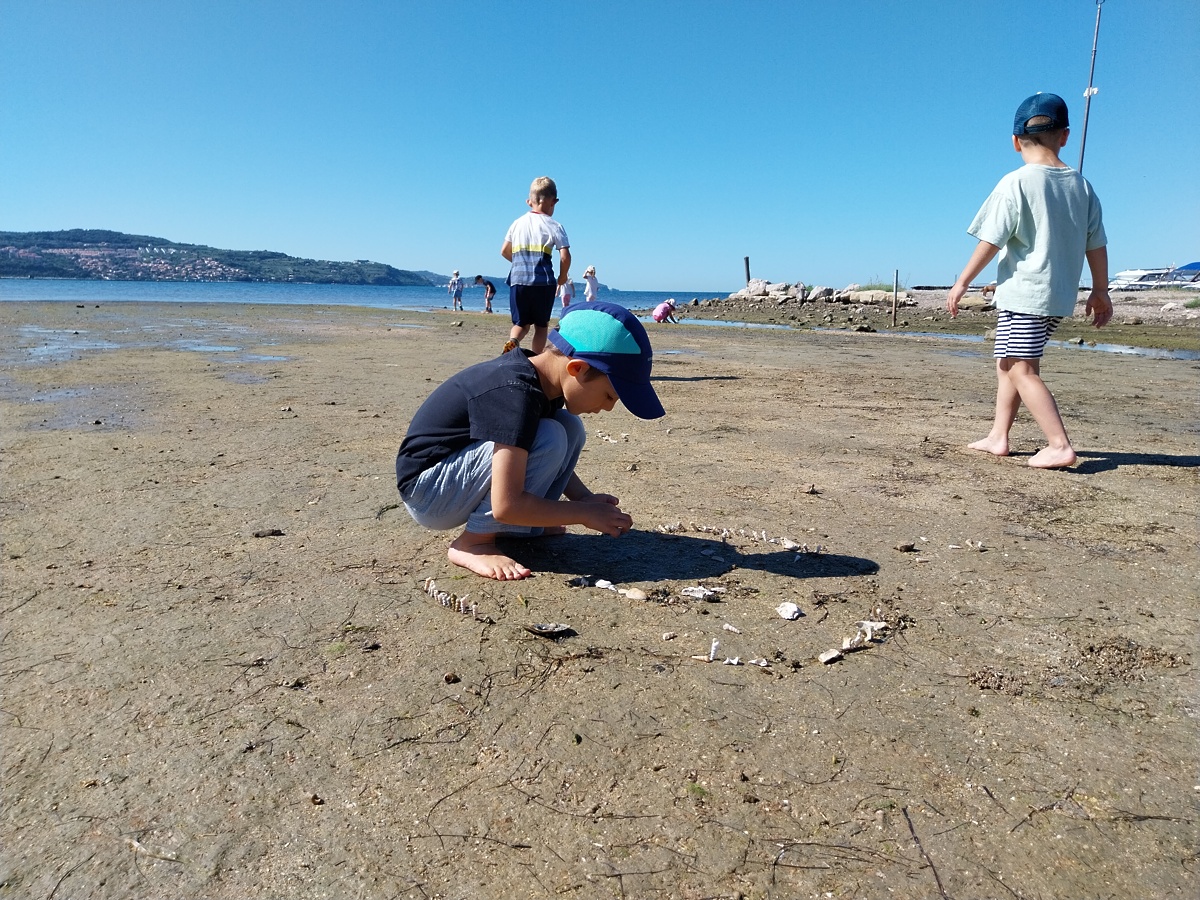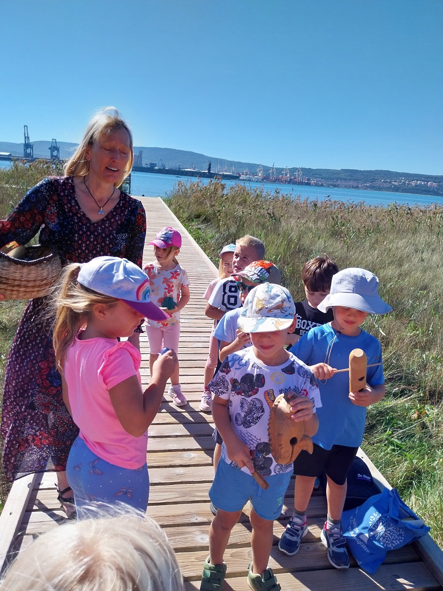 V skupini Delfini smo doživeli prav posebno dopoldne, saj nas je obiskala vsestranska umetnica, lutkarica in pevka Nika Solce. Svojo glasbeno govorico je prepletla z ljudskim izročilom ter otrokom pričarala pravljično popotovanje skozi naravo. Ob spremljavi zgodbice in glasbe smo se skupaj sprehodili od Beblerjevega trga pa vse do pokopališča školjk na Sv. Katarini, kjer smo naše potovanje zaključili sproščeno in z igro ter raziskovanjem okolice bosih nog naokrog. Otroci so ob glasbi in pripovedi doživeli čarobno združitev jezika, umetnosti in narave, ki je vse napolnila z veseljem in toplino.