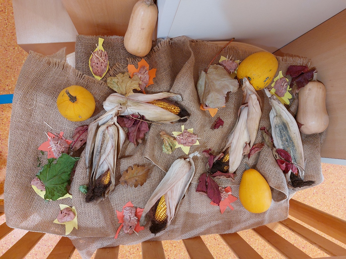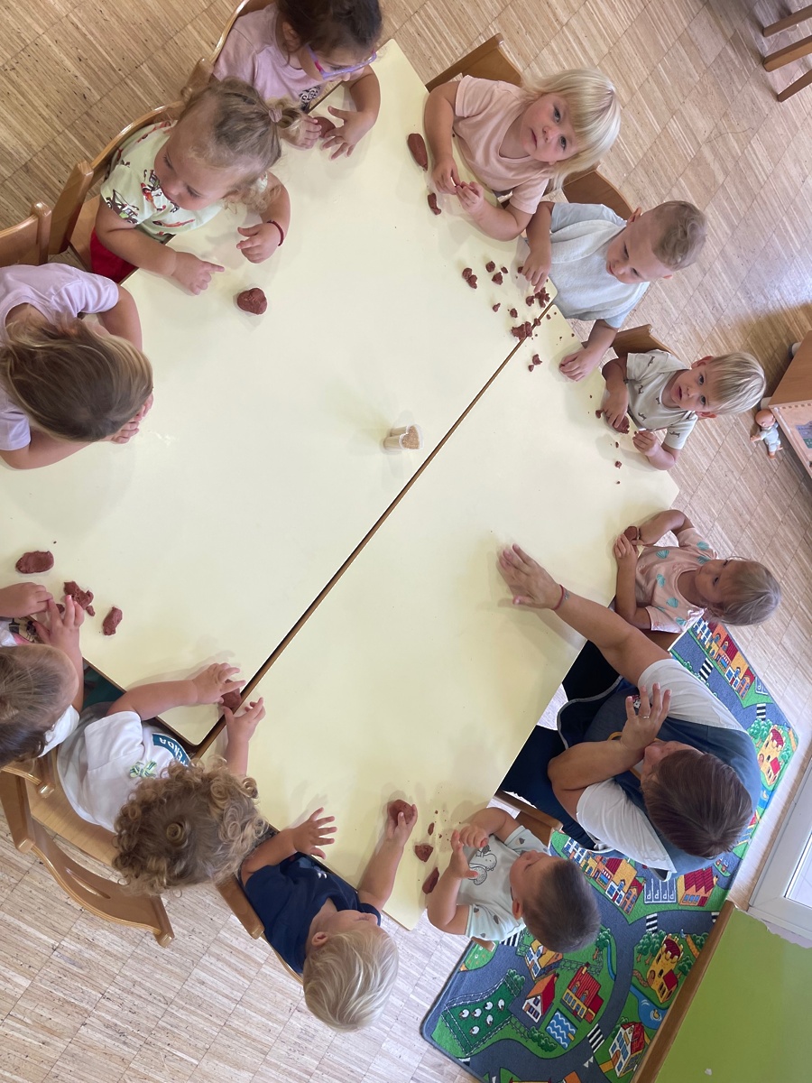 Pod našim drevesom nas je že ob prihodu v našo novo igralnico pričakal velik ježek. Radi ga opazujemo in nosimo po igralnici. Ko nas je prvič pozdravil, smo se kar malo ustrašili, vendar počasi nam je prirastel k srcu in ga kar pogrešamo, ko se nam skrije. Odločili smo se, da si naredimo vsak svojega ježka. Najprej smo potipali moko, sol, olje in vodo. Nato pa smo gnetli, dokler testo ni postalo gladko. Malo smo ga še pobarvali in gnetli naprej. Lepo nam je bilo, ko se je testo dotikalo naših prstov. Poskusili smo izdelati različne izdelke. Na koncu smo izdelali vsak svojega ježka. Da je čimbolj podoben pravemu, smo mu dodali tudi pikajoče iglice, kar je bilo zelo zabavno. Pred igralnico smo naredili razstavo, da še drugi uživajo v naših izdelkih.