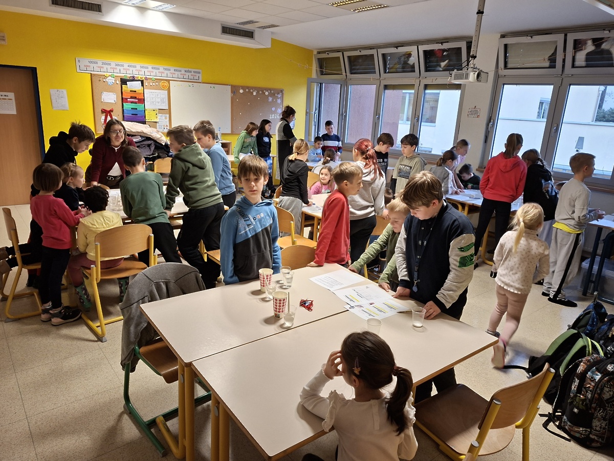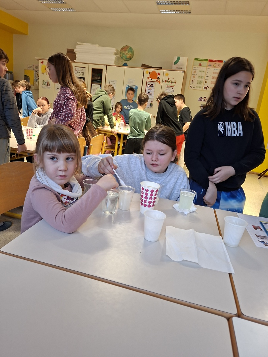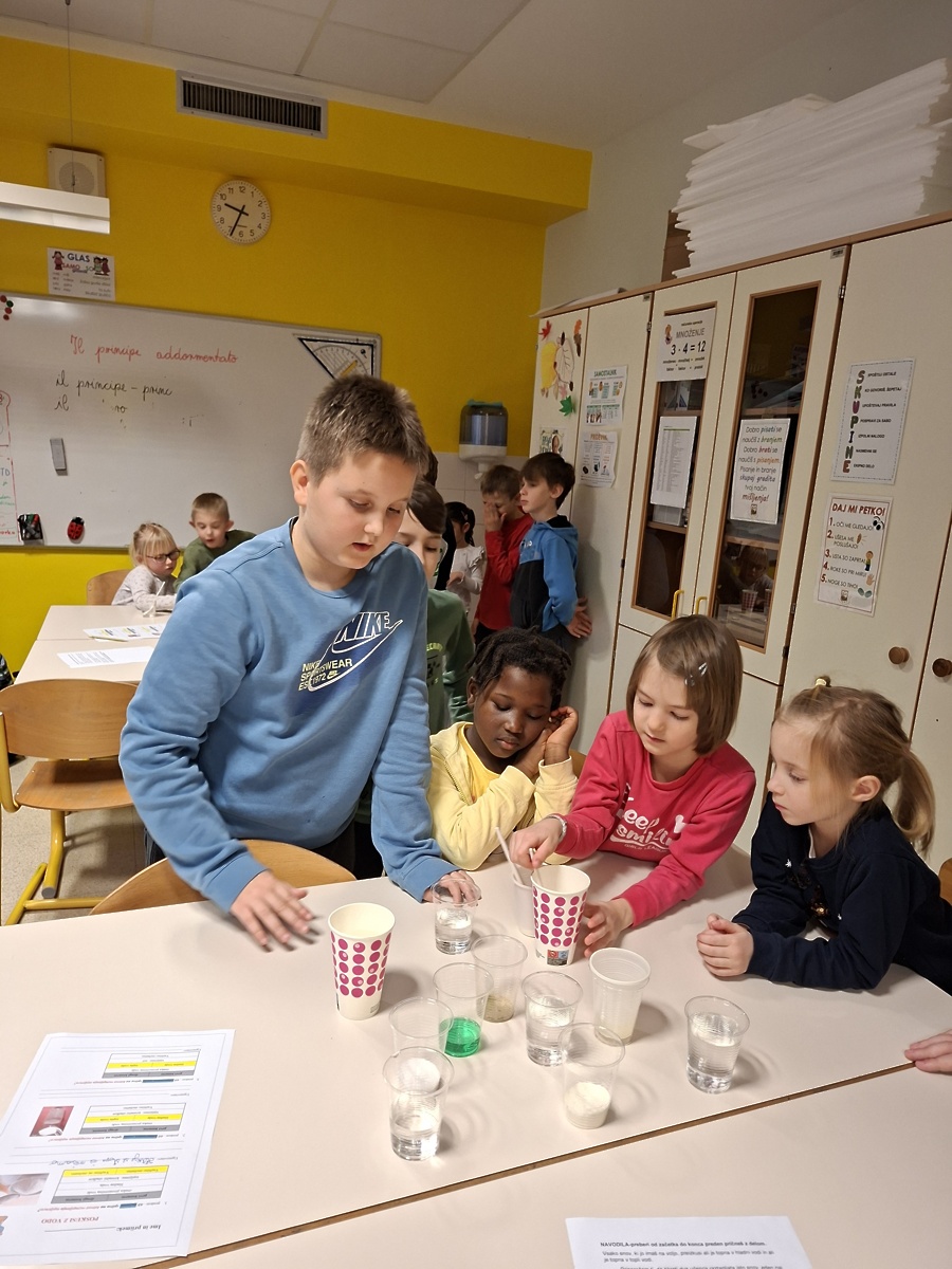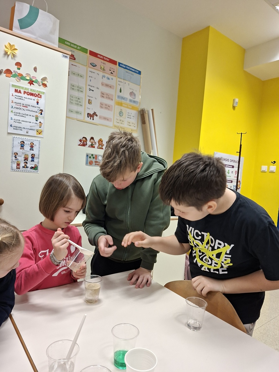 Delfini smo obiskali učiteljico Marušo ter učenke in učence 5.r Pripravili so nam učno uro iz naravoslovnega področja. Eksperimentirali smo z različnimi snovmi in spoznavali kaj je topilo in kaj topljenec. Starejši otroci so nam pomagali pri različnih nalogah mi pa smo pozorno sodelovali pri mešanju in opazovanju.