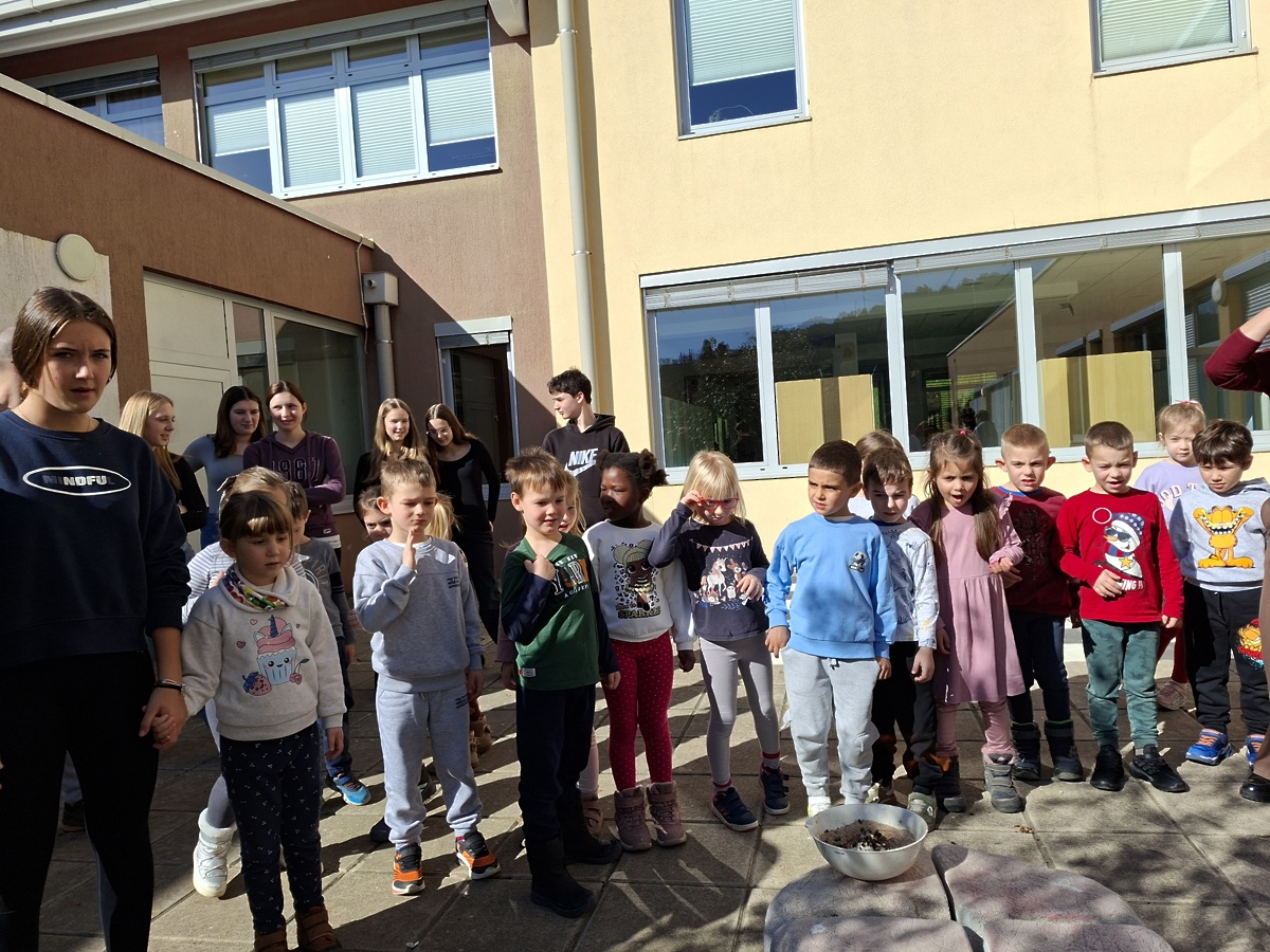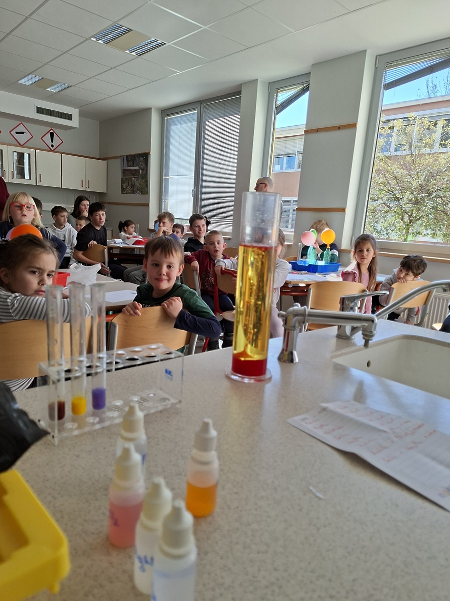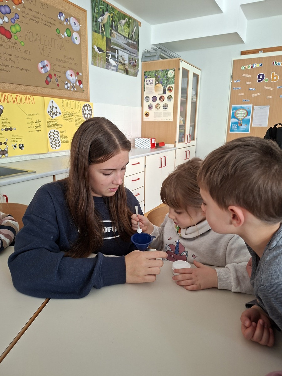 Delfini so v šoli doživeli prav posebno izkušnjo, saj so obiskali učno uro kemije. Z radovednostjo so prisluhnili učiteljici in sodelovali pri poskusih z mešanjem sode bikarbone in kisa ter citronke in kisa. Navdušeno so opazovali nastajanje mehurčkov in različno napihnjene balone ter primerjali svoja opažanja. Učenci so jim prijazno pomagali in jih spodbujali k razmišljanju. Za konec so z zanimanjem spremljali še poseben eksperiment s sodo bikarbono in sladkorjem v prahu. Obisk je bil poučen, zanimiv in poln prijetnega sodelovanja.