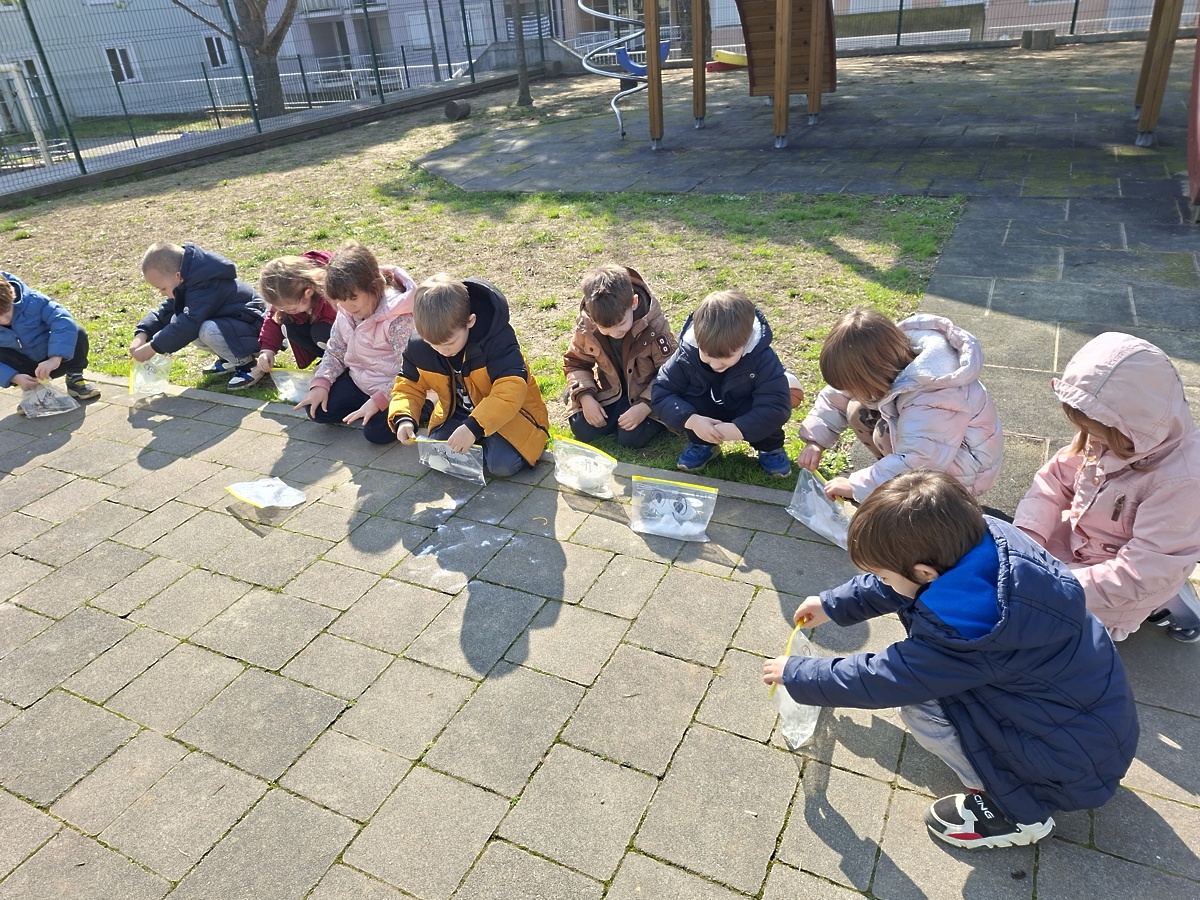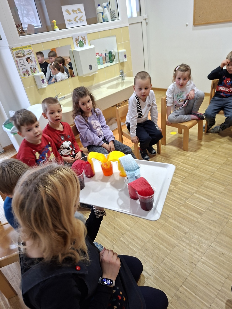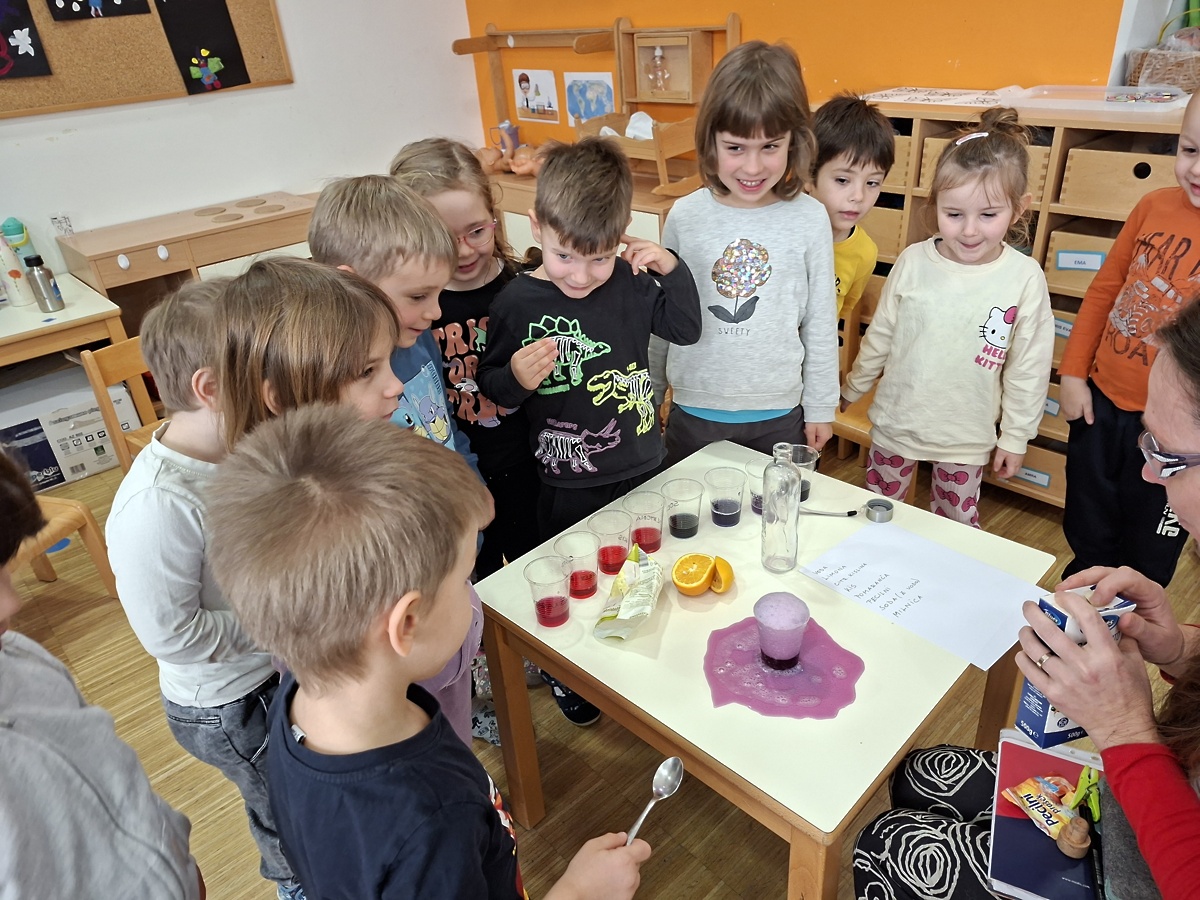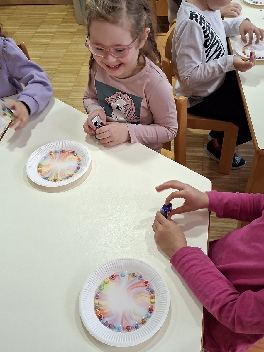 Otroci iz skupine Ribe smo se za nekaj časa spremenili v prave raziskovalce. Izvedli smo številne zanimive eksperimente. S pomočjo indikatorja iz rdečega zelja smo obarvali različne tekočine in opazovali spreminjanje barv. Izdelali smo vulkan, napihnili balon brez pihanja ter naredili »eksplozijo pošasti« v plastični vrečki. Preizkusili smo eksperiment poper in milnica ter opazovali poskočno koruzo .Igrali smo se s prelivanjem barv in izdelali mavrico z barvnimi bombončki.