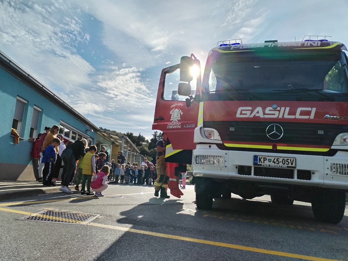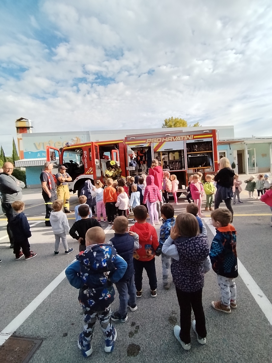 Četrtkov dopoldan pa smo se preizkusili v »gašenju ognja«, seveda s pomočjo gasilcev. G. Zlatko, g. Mitja in g. Ferminio so predstavili njihovo obleko, ki jo oblečejo za gašenje požarov, pripomočke… Poslušali smo sireno in si ogledali tudi notranjost tovornjaka.