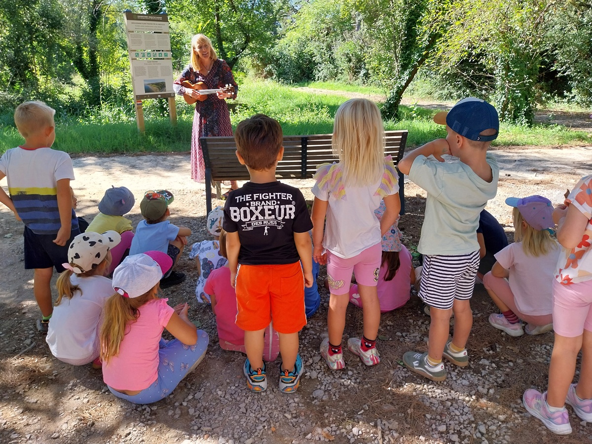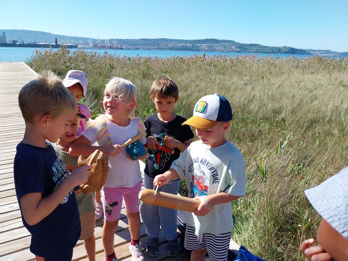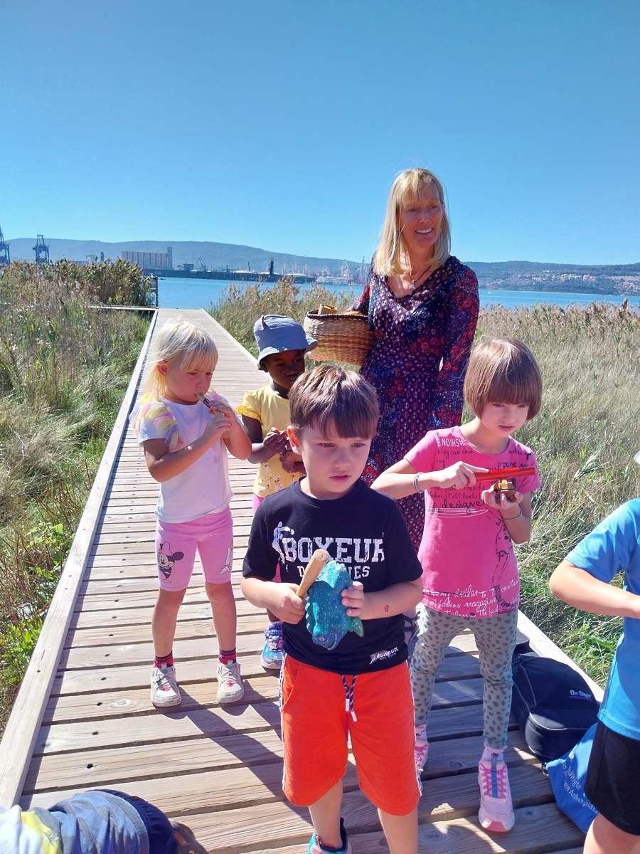 V skupini Delfini smo doživeli prav posebno dopoldne, saj nas je obiskala vsestranska umetnica, lutkarica in pevka Nika Solce. Svojo glasbeno govorico je prepletla z ljudskim izročilom ter otrokom pričarala pravljično popotovanje skozi naravo. Ob spremljavi zgodbice in glasbe smo se skupaj sprehodili od Beblerjevega trga pa vse do pokopališča školjk na Sv. Katarini, kjer smo naše potovanje zaključili sproščeno in z igro ter raziskovanjem okolice bosih nog naokrog. Otroci so ob glasbi in pripovedi doživeli čarobno združitev jezika, umetnosti in narave, ki je vse napolnila z veseljem in toplino.