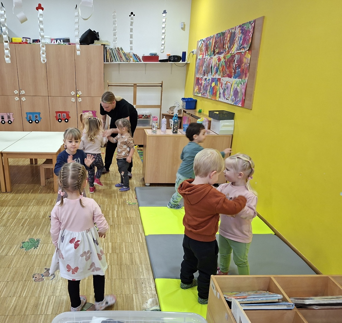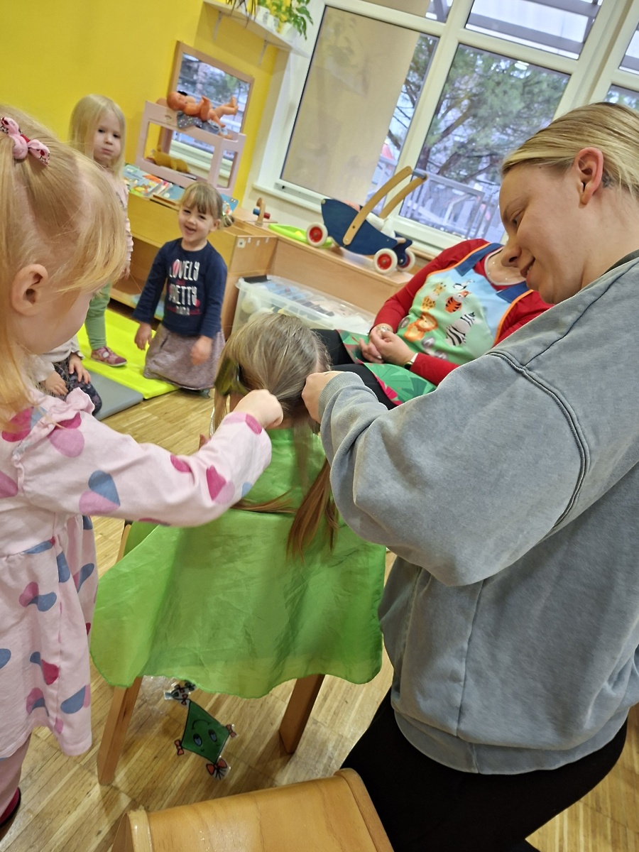 Obiskala nas je mamica od Rubi. Otrokom je povedala, kaj dela frizerka in pokazala nekaj predmetov, ki jih potrebuje pri svojem delu. Vsi otroci so od doma prinesli svoje glavnike. Deklicam je naredila frizure po njihovih željah, dečke pa je lepo počesala. Na koncu nam je pustila igračo - glavo in pripomočke za frizure ter otrokom razdelila nalepke. Skupaj smo še zapeli in zaplesali.