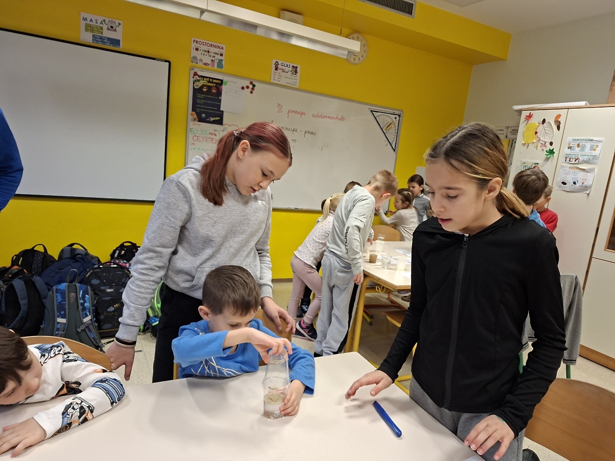 Delfini smo obiskali učiteljico Marušo ter učenke in učence 5.r Pripravili so nam učno uro iz naravoslovnega področja. Eksperimentirali smo z različnimi snovmi in spoznavali kaj je topilo in kaj topljenec. Starejši otroci so nam pomagali pri različnih nalogah mi pa smo pozorno sodelovali pri mešanju in opazovanju.