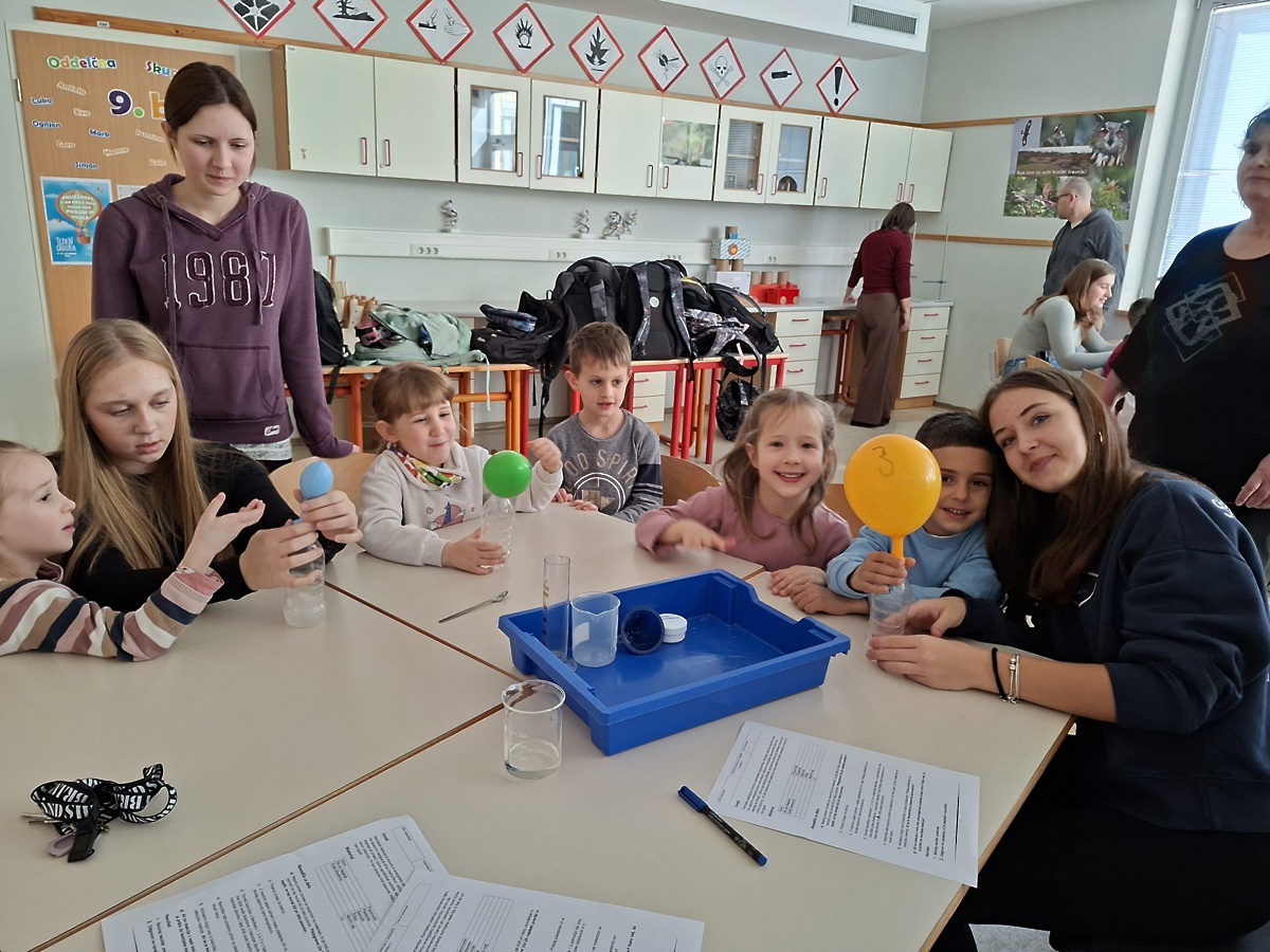 Delfini so v šoli doživeli prav posebno izkušnjo, saj so obiskali učno uro kemije. Z radovednostjo so prisluhnili učiteljici in sodelovali pri poskusih z mešanjem sode bikarbone in kisa ter citronke in kisa. Navdušeno so opazovali nastajanje mehurčkov in različno napihnjene balone ter primerjali svoja opažanja. Učenci so jim prijazno pomagali in jih spodbujali k razmišljanju. Za konec so z zanimanjem spremljali še poseben eksperiment s sodo bikarbono in sladkorjem v prahu. Obisk je bil poučen, zanimiv in poln prijetnega sodelovanja.
