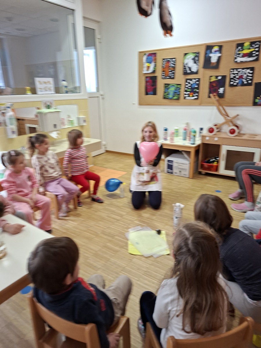 Otroci iz skupine Ribe smo se za nekaj časa spremenili v prave raziskovalce. Izvedli smo številne zanimive eksperimente. S pomočjo indikatorja iz rdečega zelja smo obarvali različne tekočine in opazovali spreminjanje barv. Izdelali smo vulkan, napihnili balon brez pihanja ter naredili »eksplozijo pošasti« v plastični vrečki. Preizkusili smo eksperiment poper in milnica ter opazovali poskočno koruzo .Igrali smo se s prelivanjem barv in izdelali mavrico z barvnimi bombončki.