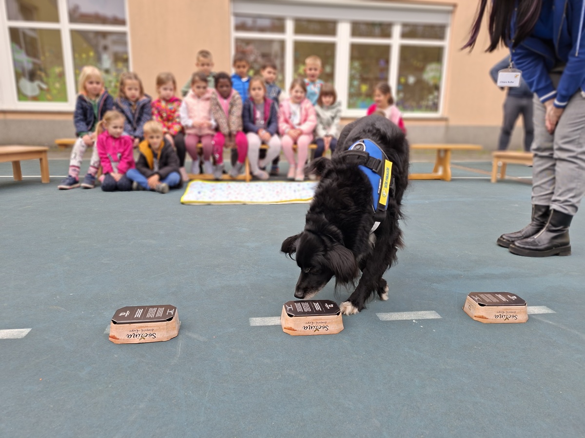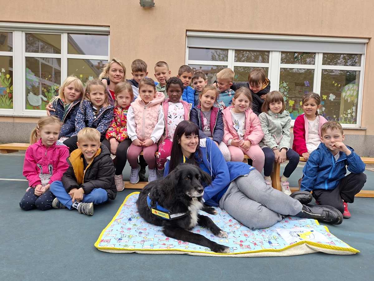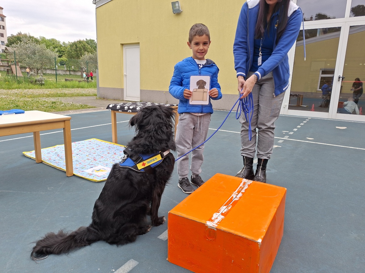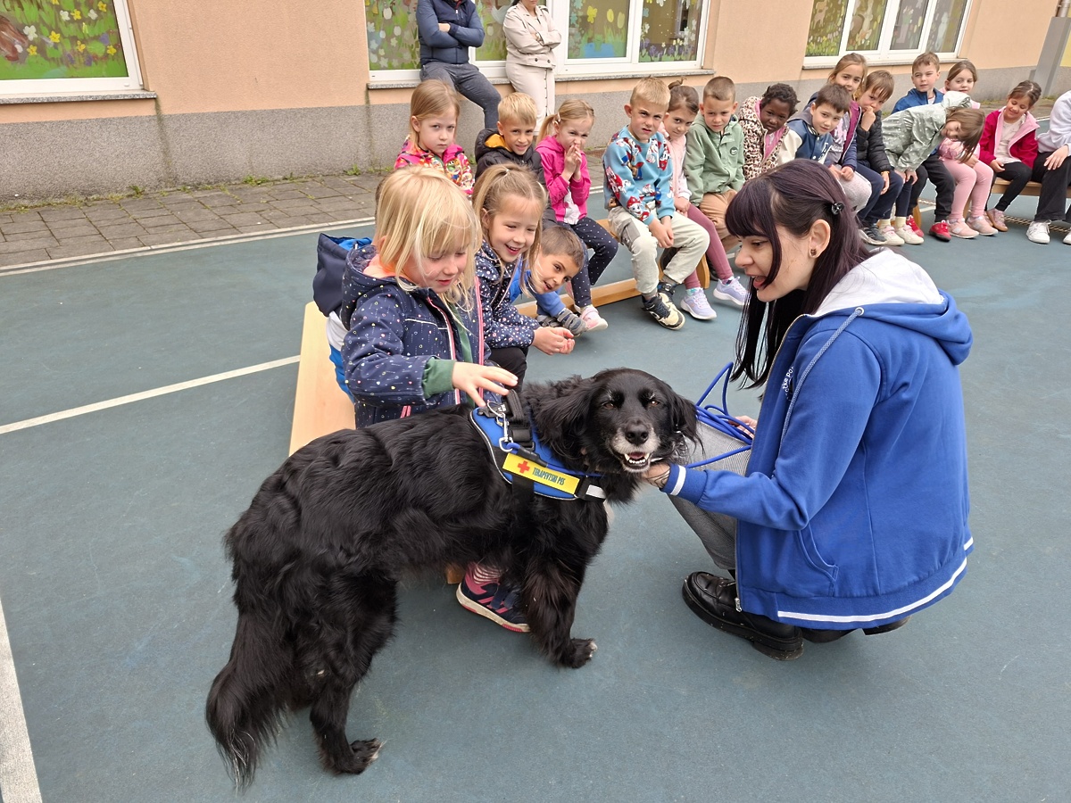 V našem vrtcu nas je obiskal prav poseben gost, kuža Dio s svojo vodnico Chiaro Rotter, ki je s svojo mirno prisotnostjo in toplino pričaral nasmehe na otroških obrazih. Otroci skupine Delfini so ga toplo pozdravili in opazovali, kje se nahaja glede na mizo in škatlo. Skozi gibanje, besede in sodelovanje so utrjevali prostorske odnose, jih poimenovali tudi v italijanskem jeziku ter ob tem krepili samozavest in veselje do učenja. Poseben čar je imela igra »Tačkin spomin«, pri kateri so otroci Dia preizkusili, ali bo našel svoj priboljšek. Obisk smo zaključili z delovnim listom, ki nam ga je »prinesel« Dio, in ga skrbno shranili v zvezke za lep spomin na dan, poln topline, učenja in nepozabnih pasjih tačk.