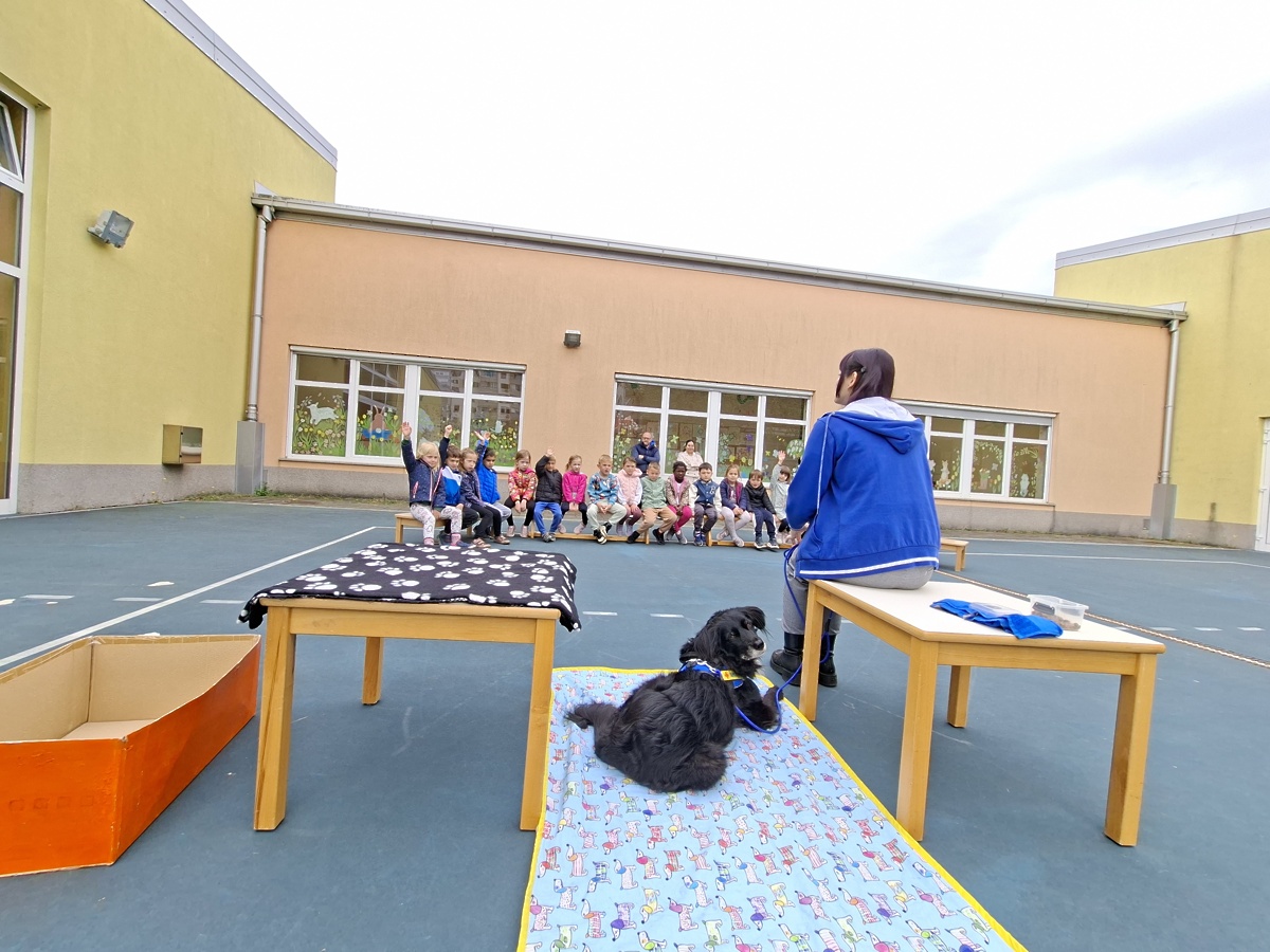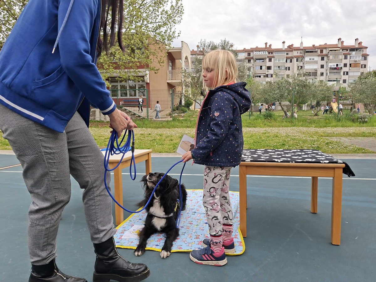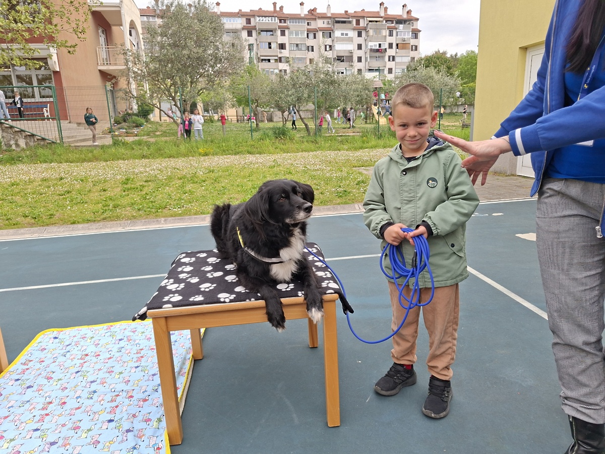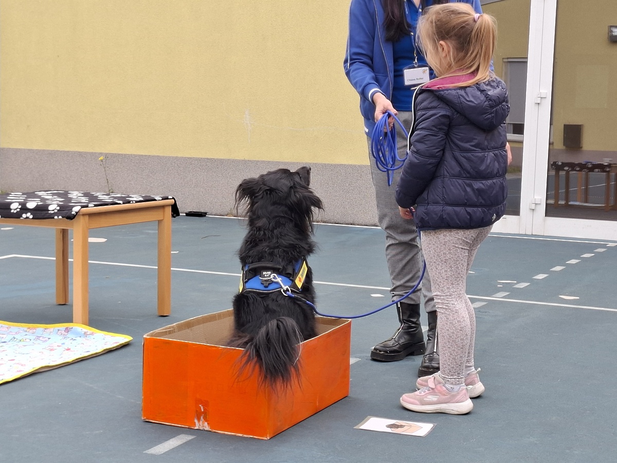 V našem vrtcu nas je obiskal prav poseben gost, kuža Dio s svojo vodnico Chiaro Rotter, ki je s svojo mirno prisotnostjo in toplino pričaral nasmehe na otroških obrazih. Otroci skupine Delfini so ga toplo pozdravili in opazovali, kje se nahaja glede na mizo in škatlo. Skozi gibanje, besede in sodelovanje so utrjevali prostorske odnose, jih poimenovali tudi v italijanskem jeziku ter ob tem krepili samozavest in veselje do učenja. Poseben čar je imela igra »Tačkin spomin«, pri kateri so otroci Dia preizkusili, ali bo našel svoj priboljšek. Obisk smo zaključili z delovnim listom, ki nam ga je »prinesel« Dio, in ga skrbno shranili v zvezke za lep spomin na dan, poln topline, učenja in nepozabnih pasjih tačk.
