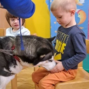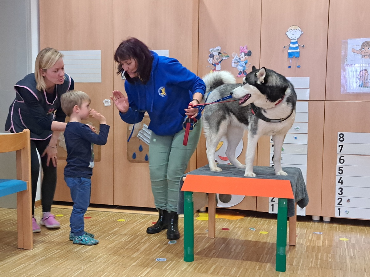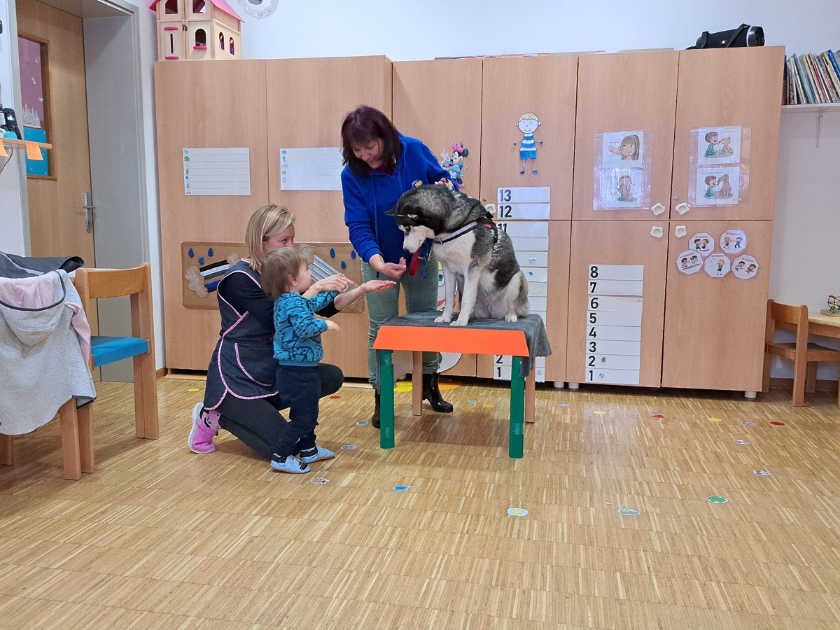 V vrtcu smo ponovno gostili terapevtsko psičko Ammely in njeno vodnico Justino. Otroci so najprej obnovili pravila obnašanja ob stiku s psom, nato pa izvedeli, kako se Ammely pozimi zaščiti pred mrazom. Ob prvem stiku so jo pobožali, opazovali njeno dlako in jo spraševali o življenju v zimskem času. Sledila je zabavna matematična igra, v kateri so otroci opisovali položaj Ammely glede na njeno hiško ter se učili matematičnih pojmov, kot so pred, za, na, v, levo in desno. S pomočjo kartic, na katerih je bil kuža v različnih položajih glede na škatlo, so preverili svoje znanje in popravljali morebitne napake. Srečanje smo zaključili z uganko, ki je otroke spodbudila k razmišljanju. Obisk Ammely je bil poučen in zabaven – otroci so se učili skozi igro ter razvijali spoštljiv in pravilen odnos do živali.
